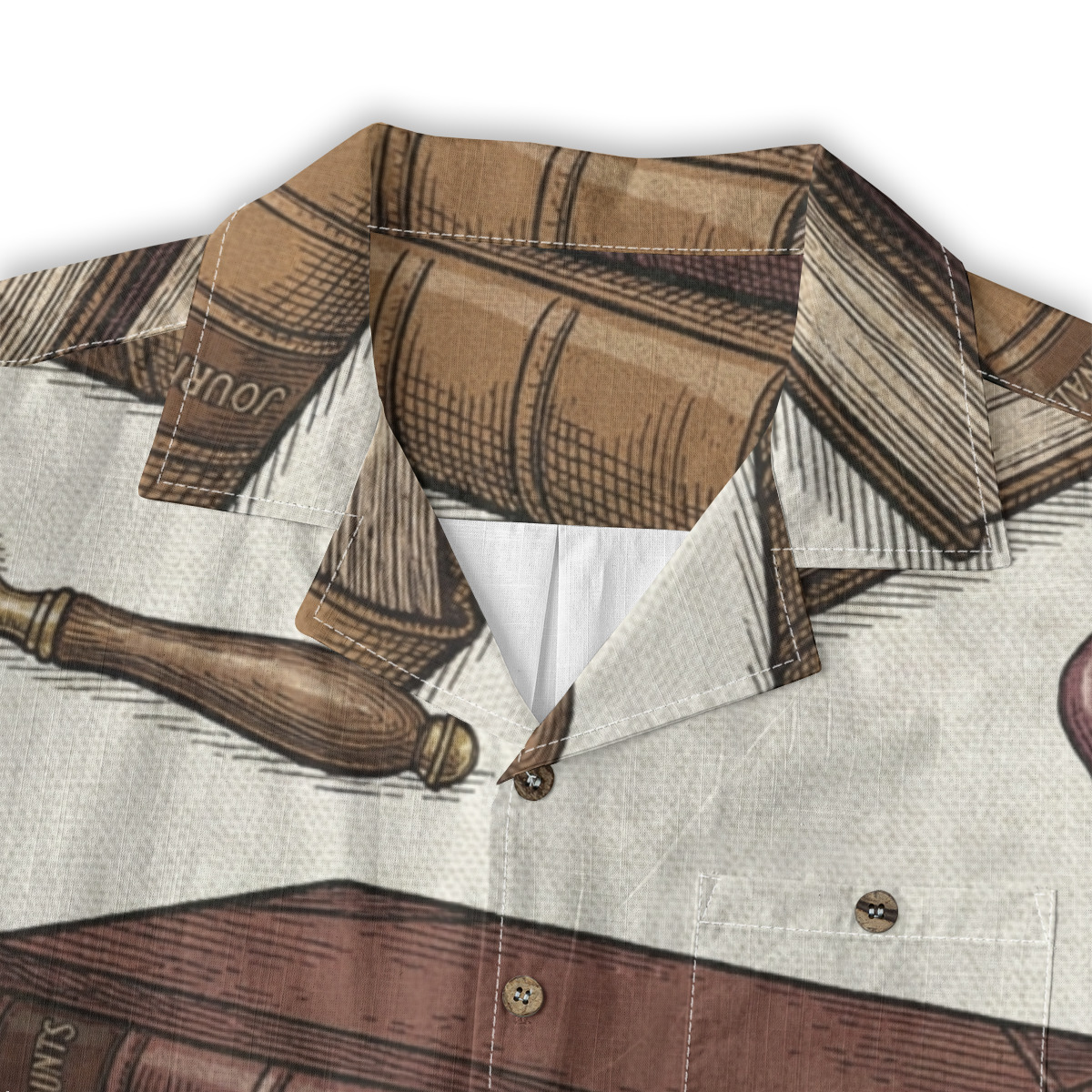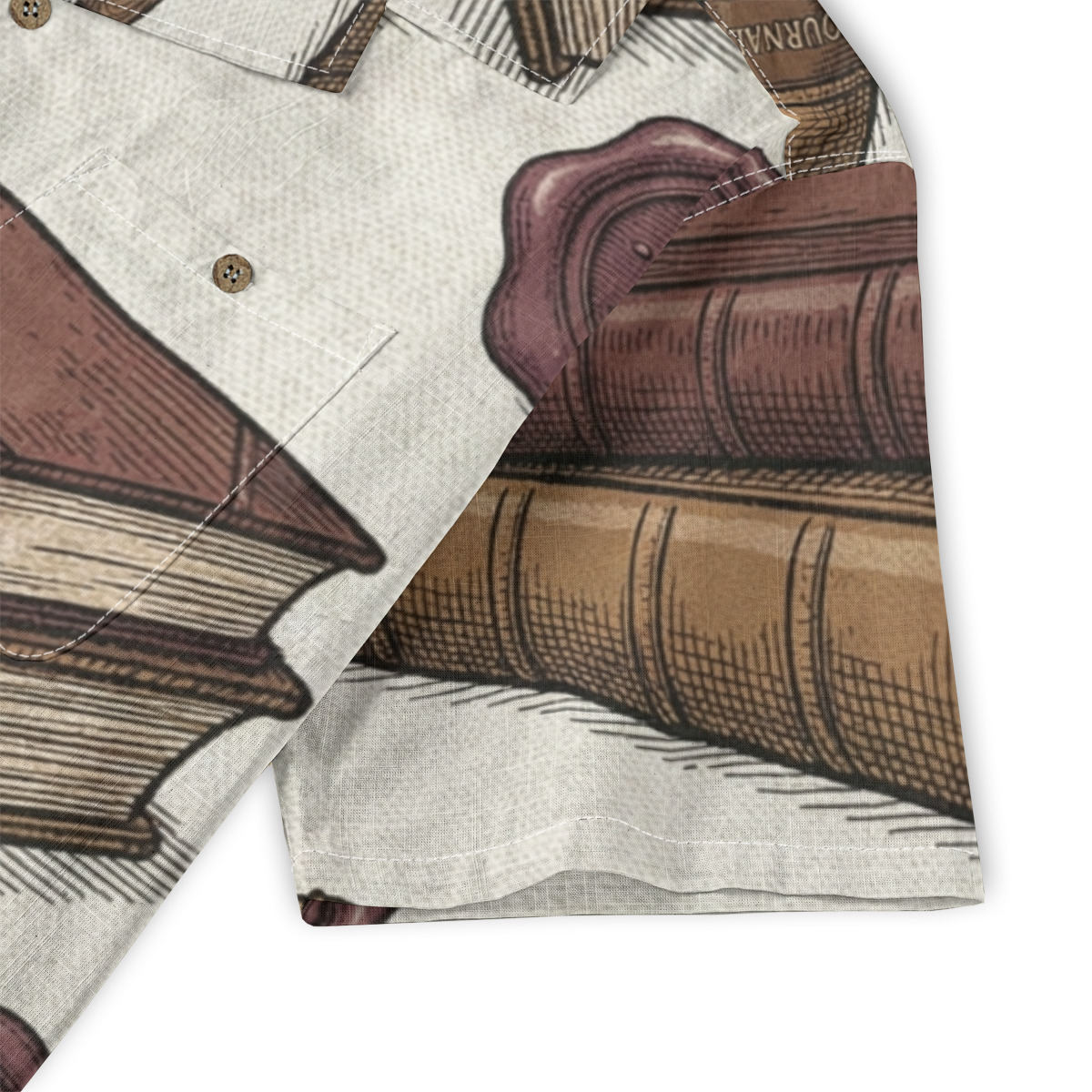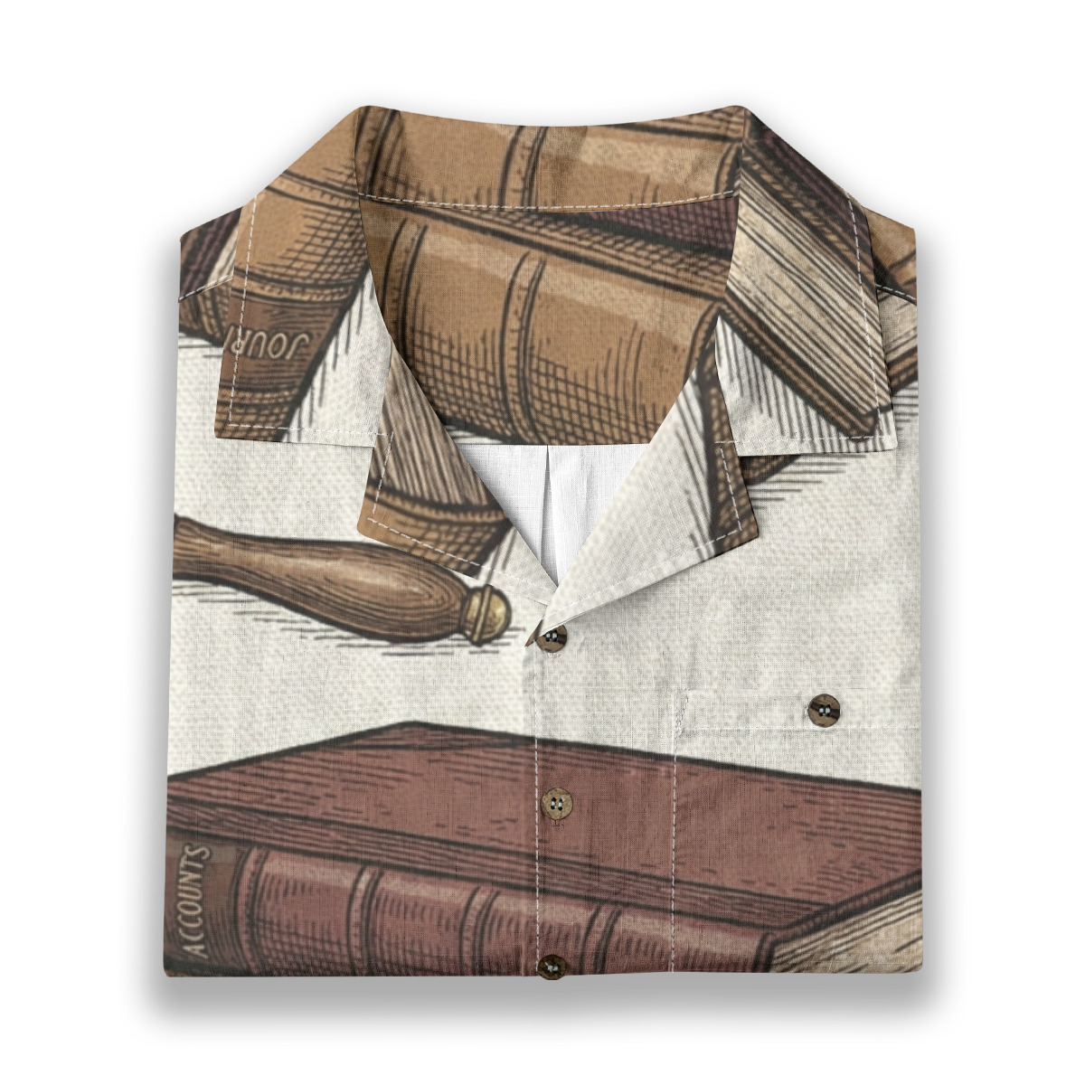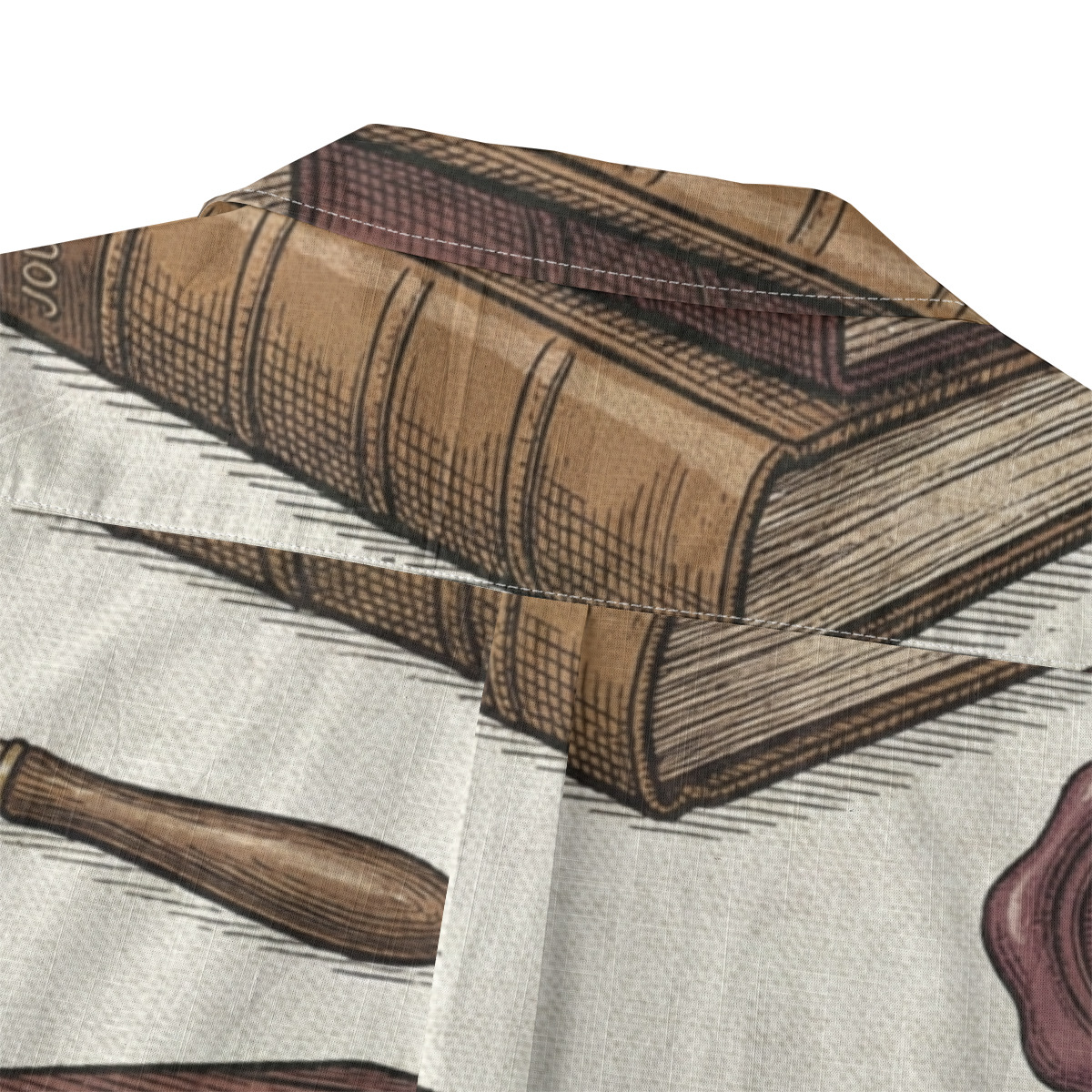 This Hawaiian shirt features a detailed vintage library illustration pattern with stacked books, magnifying glasses, and wax seals.