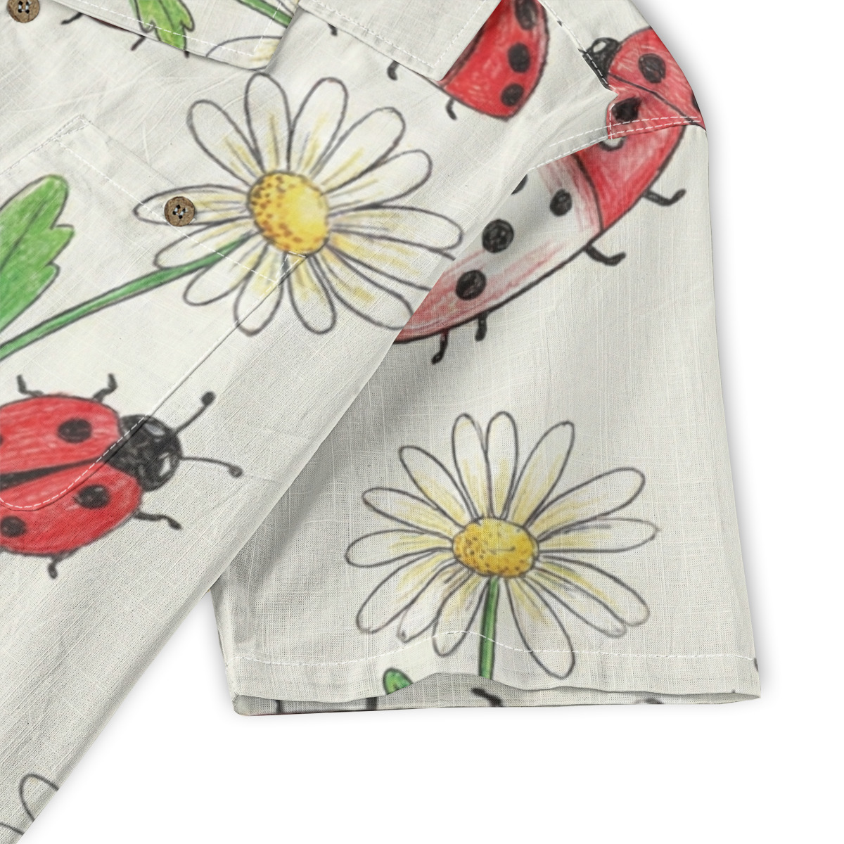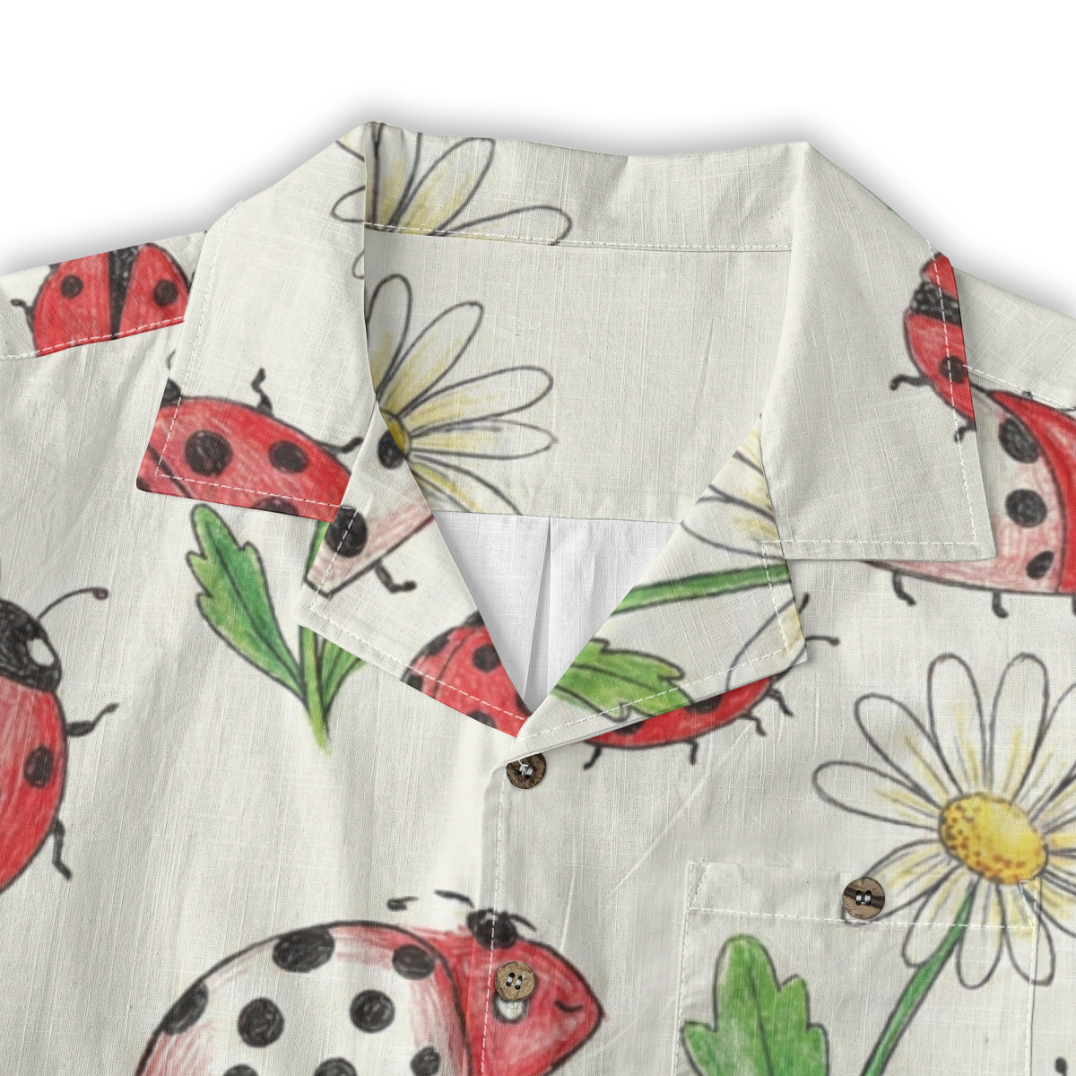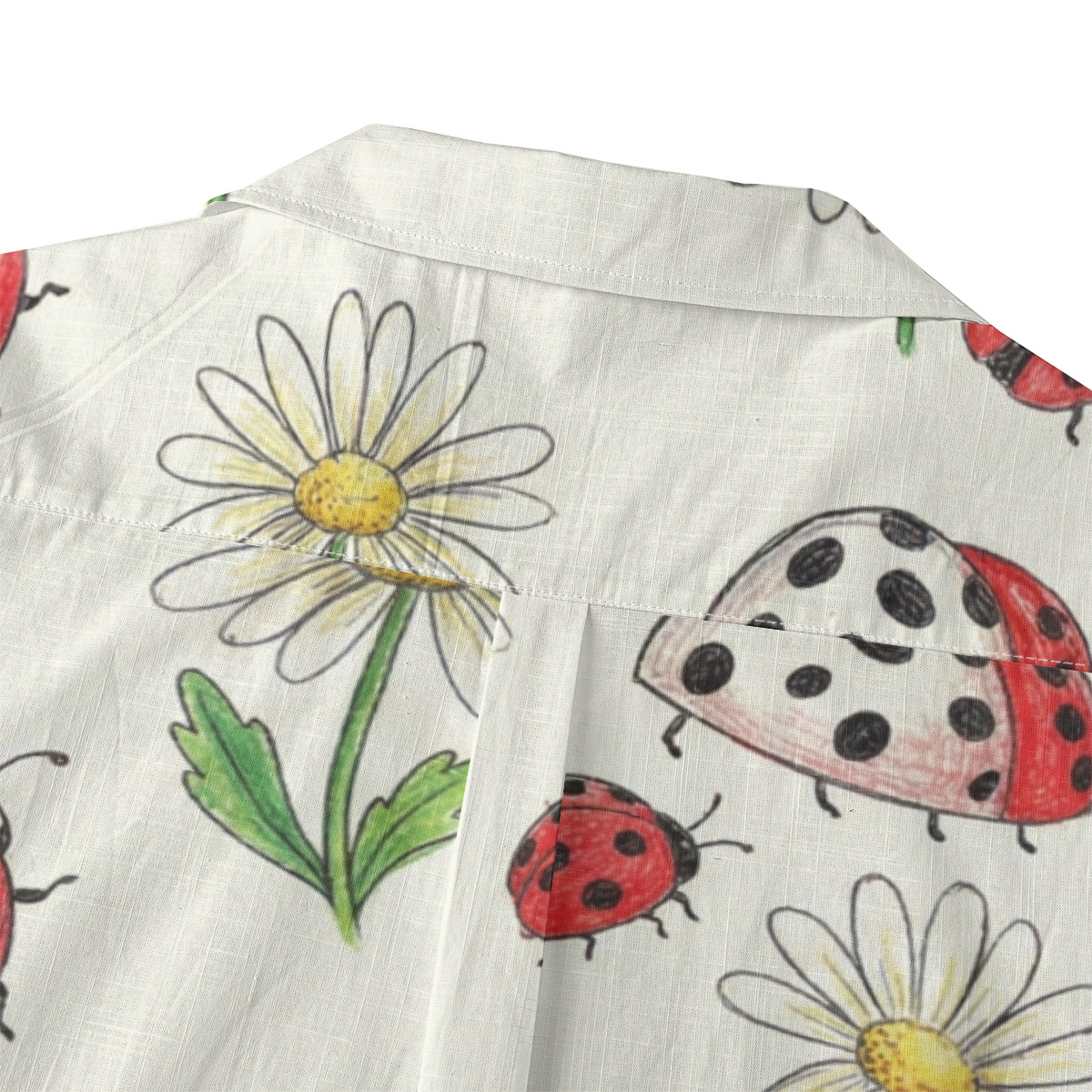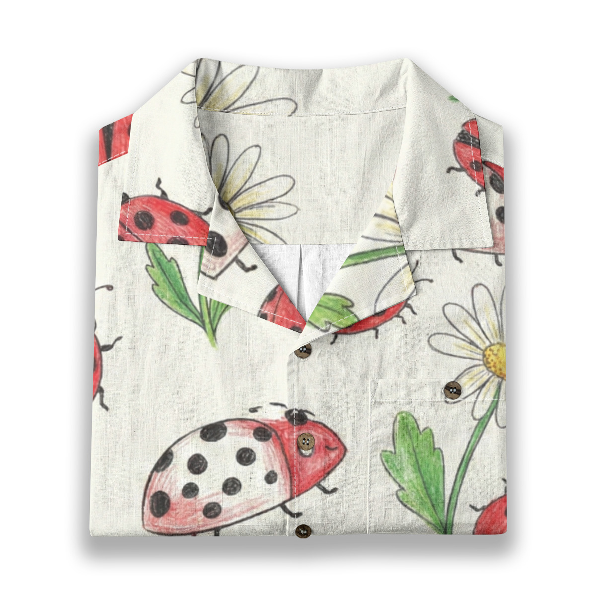 Add a playful, cheerful touch to your wardrobe with this ladybug and daisy illustration Hawaiian shirt.
