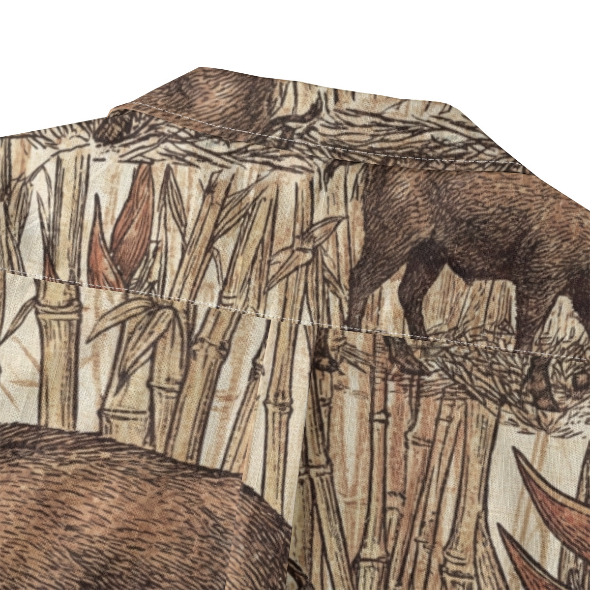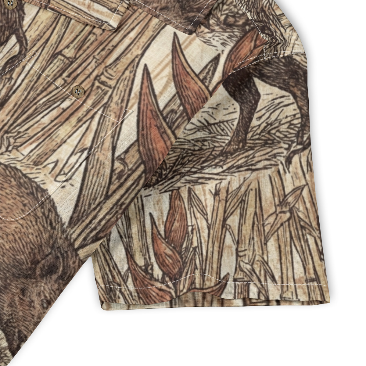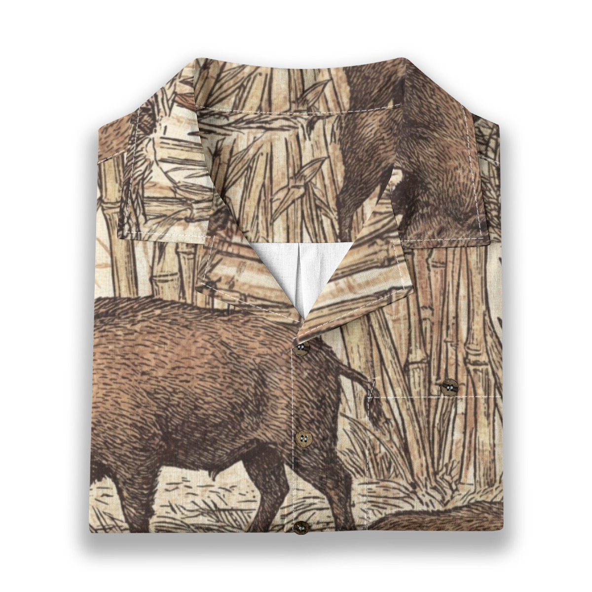 - This Hawaiian shirt features a richly detailed vintage-style illustration of wild boars moving through dense bamboo foliage.